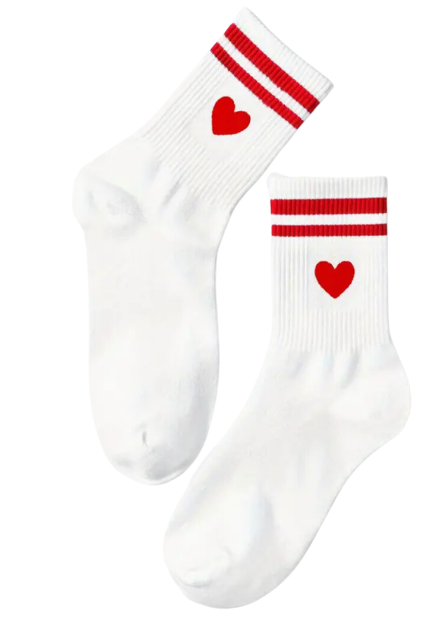Look fierce on the court with our crew socks with red hearts and red athletic striping.