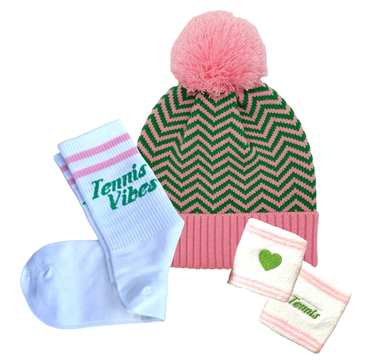 Our Runway Athletics "Tennis Vibes Socks" matching wristbands and cozy green and pink beanie are the perfect trio.