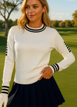Fall in love with your new go-to layer — our super stylish pullover knit that blends sporty flair with everyday chic. Designed with a flattering, easy fit, and sleek stripe detailing on the upper arms and cuffs for that extra pop of personality.