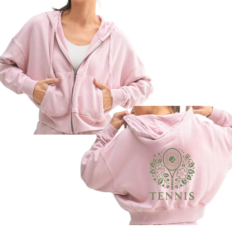 Cozy, Chic, and Ready for Action: The Soft Lilac Zip Up Hoodie Jacket with custom designed Appliqué on back.