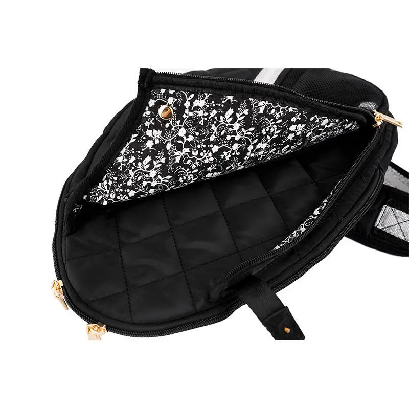 Quilted pickle ball collection is the perfect bag for the hottest sport! This bag has so much function it will keep you organized on and off court! Made of quilted nylon with adjustable shoulder strap and exterior mesh pocket. Spot clean. Dimensions 16L x 12.5W x 3.5D