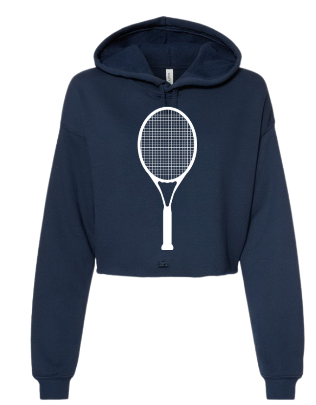 Our trendy cropped hoodie sweatshirt is a must-have for your tennis wardrobe. Its raw edge and dyed to match drawstrings make it fashion forward while the poly cotton brushed fleece brings an unmatched level of comfort. White Tennis racquet screen appliqué is a great touch.