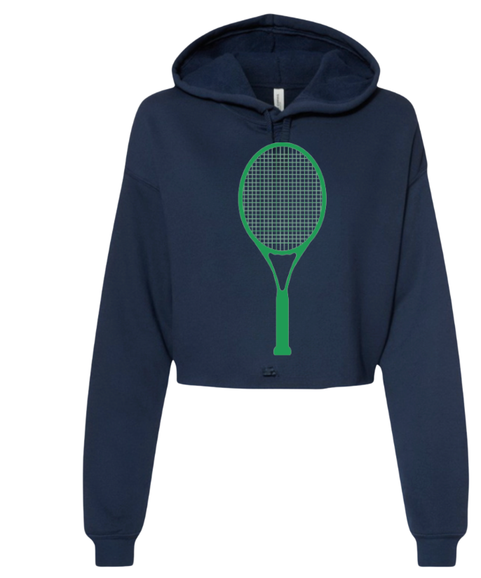 Our trendy cropped hoodie sweatshirt is a must-have for your tennis wardrobe. Its raw edge and dyed to match drawstrings make it fashion forward while the poly cotton brushed fleece brings an unmatched level of comfort. Green Tennis racquet screen appliqué is a great touch.
