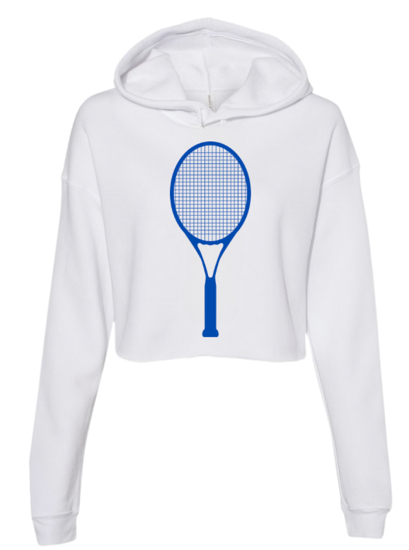 Our trendy cropped hoodie sweatshirt is a must-have for your tennis wardrobe. Its raw edge and dyed to match drawstrings make it fashion forward while the poly cotton brushed fleece brings an unmatched level of comfort. Blue Tennis racquet screen appliqué is a great touch.