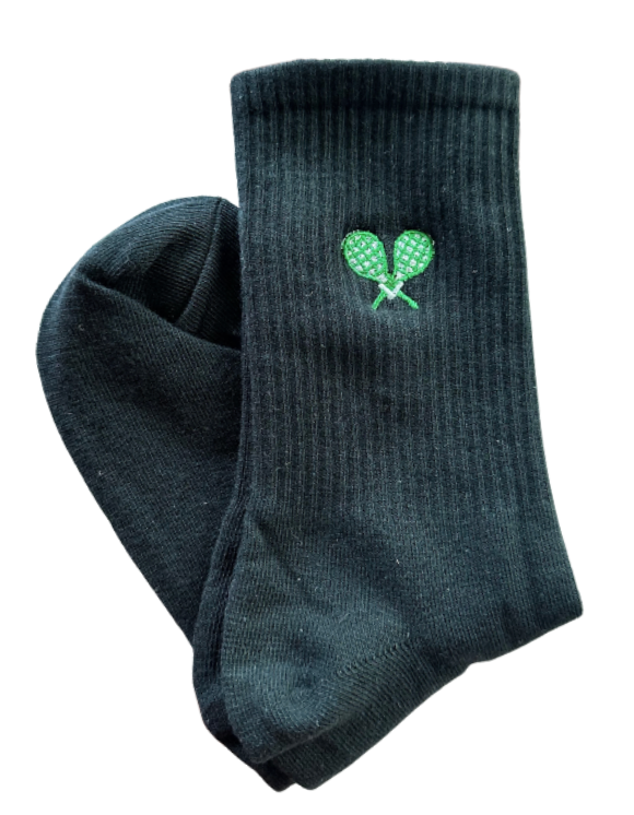 Look fierce on the court with our 3/4 length black crew socks with embroidered green racquets.