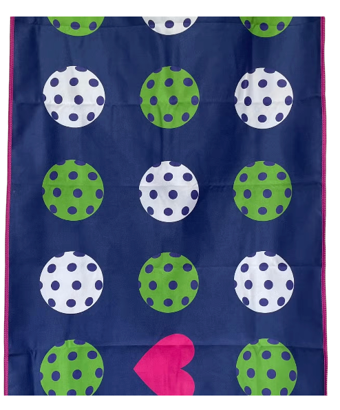 Elevate your pickleball gear with our latest towel, featuring a bold graphic of several pickleballs in a classic blue, white, and green colorway.
