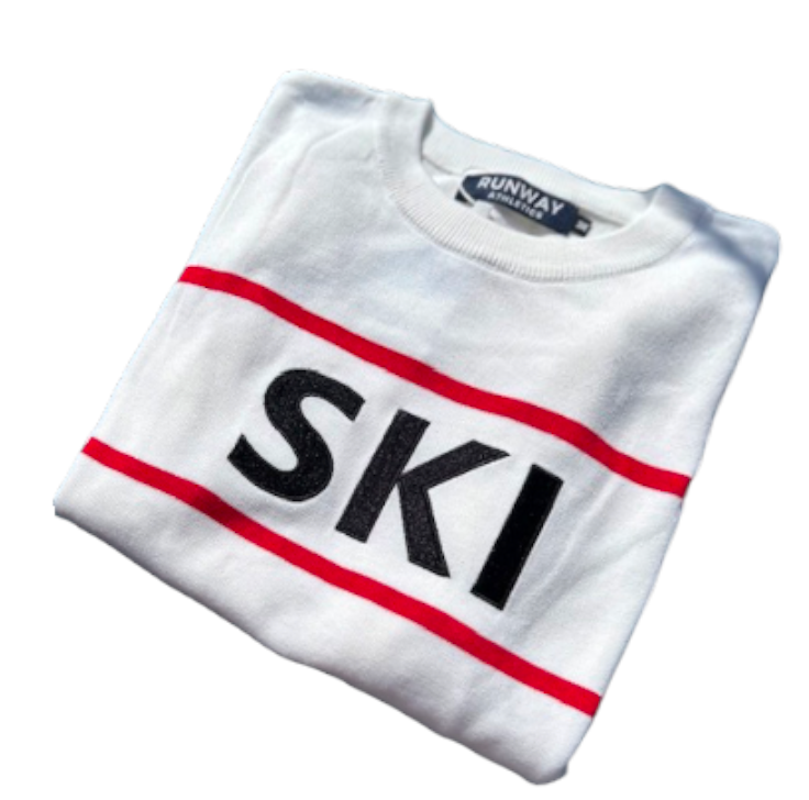 Our RA-designed crew neck lightweight knit sweater with ribbed trim is a must-have addition to your wardrobe. Featuring a striped trim cuff and embroidered lettering, it perfectly balances chic and sporty.