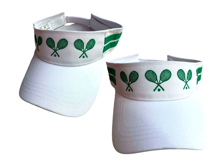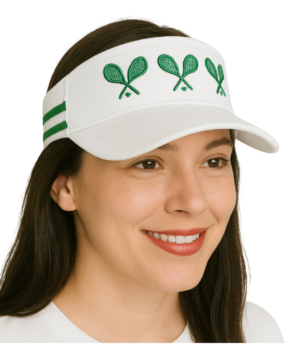 Our Runway Athletics custom visors are crafted from the finest white cotton canvas and feature green accent stripes on the sides, along with a velcro strap for easy fastening. Designed with a slightly higher profile, these visors offer excellent protection for your hairline from sun exposure.