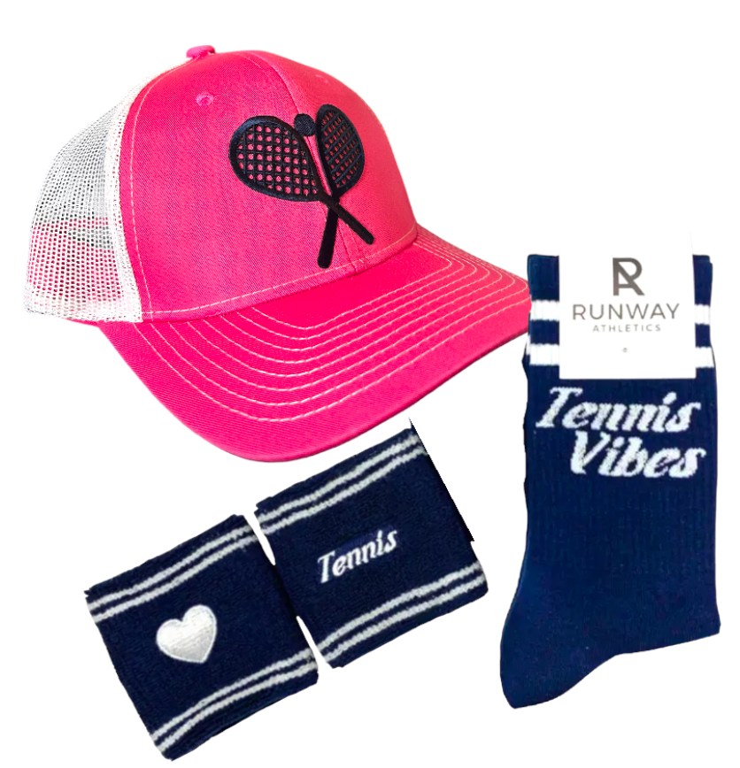 - Embellishment: Custom embroidered white double tennis racquets patch for a sporty touch.