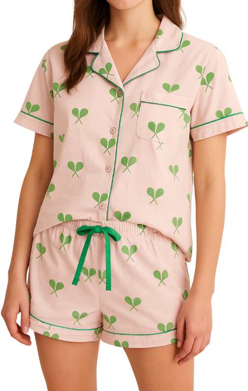 Introducing our Custom-Designed Pale Pink & Kelly Green Satin Pajama Short Set—the perfect blend of luxury and comfort!