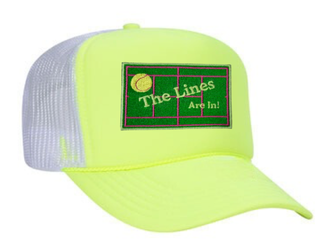 Step up your game with our stylish lime and white Trucker Hat. Featuring a custom embroidered patch with the phrase "The Lines Are In," this hat is perfect for showing off your court confidence and flair whether you're on the court, on vacation, or just out and about.