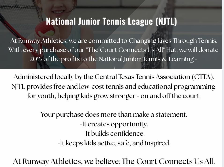 With every purchase of our exclusive T-Shirt, 20% of profits will be donated to National Junior Tennis & Learning of Austin (NJTL – Austin) to help grow and support youth tennis in our community.