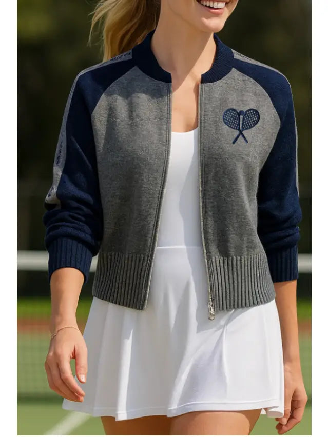 Our oh so cozy and stylish zip up sweater bomber is sure to get noticed. Grey and navy steal the show with a little added tennis pizazz. Poly knit so it won't wrinkle, the perfect weight for all year around wear and the navy embroidered tennis appliqué finishes it off. One size fits most (S-L). 3/4 sleeve for active lifestyle.